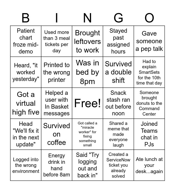 This bingo card has a free space and 29 words: Logged into the wrong environment, Found a fix before IT did, Helped a user with In Basket messages, Finally got your SmartPhrase to save, Patient chart froze mid-demo, Brought leftovers to work, Printed to the wrong printer, Survived on coffee, Snack stash ran out before noon, Energy drink in hand before 8am, Someone brought donuts to the Command Center, Ate lunch at your desk...again, Said "Try logging out and back in", Created a ServiceNow ticket you already solved, Had to explain SmartSets for the 10th time that day, Head, That's not how it worked in the old system", Got called a "miracle worker" for fixing something small, Head "We'll fix it in the next update", Gave someone a pep talk, Got a virtual high five, Shared a meme that made everyone laugh, Celebrated your first "zero ticket" day, Survived a double shift, Heard, "it worked yesterday", Stayed past assigned hours, Used more than 3 meal tickets per day, Joined Teams chat in PJs, Was in bed by 8pm and Saw someone cry.