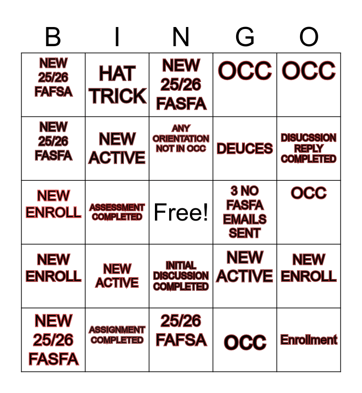 This bingo card has a free space and 24 words: NEW ACTIVE, ASSIGNMENT COMPLETED, ANY ORIENTATION NOT IN OCC, NEW 25/26 FASFA, OCC, NEW 25/26 FAFSA, NEW 25/26 FASFA, HAT TRICK, 3 NO FASFA EMAILS SENT, INITIAL DISCUSSION COMPLETED, DEUCES, NEW ENROLL, NEW ACTIVE, NEW ENROLL, NEW ACTIVE, occ, OCC, NEW 25/26 FASFA, DISUCSSION REPLY COMPLETED, ASSESSMENT COMPLETED, Enrollment, NEW ENROLL, OCC and 25/26 FAFSA.