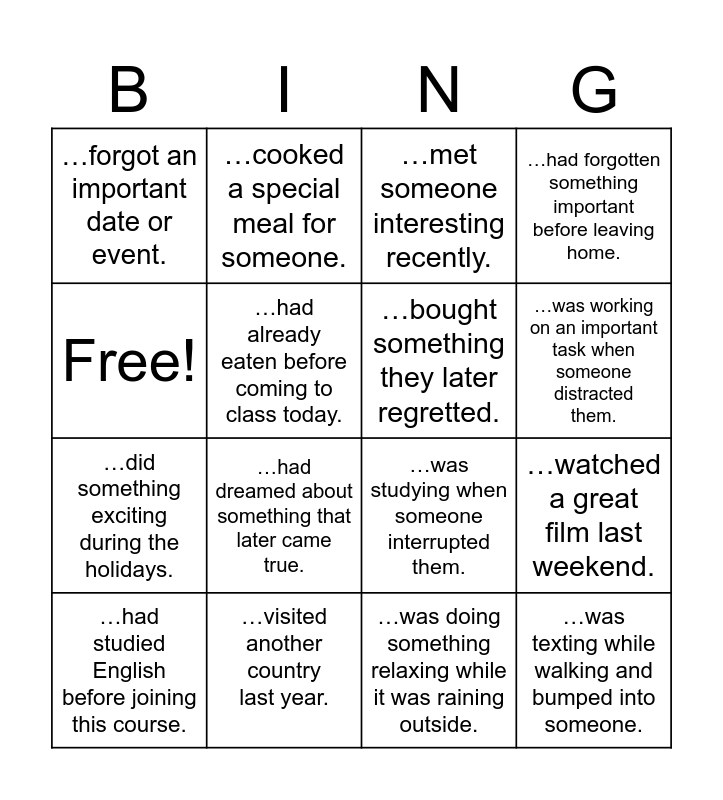 This bingo card has 16 words: …visited another country last year., …watched a great film last weekend., …met someone interesting recently., …forgot an important date or event., …did something exciting during the holidays., …cooked a special meal for someone., …was studying when someone interrupted them., …was doing something relaxing while it was raining outside., Free!, …had already eaten before coming to class today., …had studied English before joining this course., …had forgotten something important before leaving home., …had dreamed about something that later came true., …was working on an important task when someone distracted them., …bought something they later regretted. and …was texting while walking and bumped into someone..