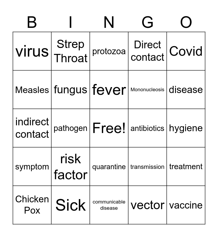 This bingo card has a free space and 31 words: communicable disease, Non-Communicable disease, pathogen, bacteria, virus, protozoa, fungus, transmission, antibiotics, vector, hygiene, vaccine, acute, chronic, disease, cure, treatment, risk factor, symptom, quarantine, Covid, Flu, Chicken Pox, Strep Throat, Mononucleosis, Measles, Direct contact, indirect contact, Sick, fever and cough.