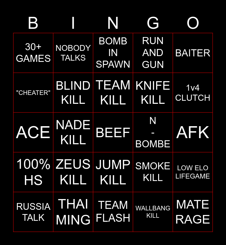 This bingo card has 25 words: ZEUS KILL, TEAM FLASH, TEAM KILL, RUSSIA TALK, BAITER, 30+ GAMES, "CHEATER", NOBODY TALKS, N - BOMBE, JUMP KILL, KNIFE KILL, ACE, SMOKE KILL, LOW ELO LIFEGAME, BLIND KILL, MATE RAGE, AFK, BOMB IN SPAWN, 1v4 CLUTCH, NADE KILL, BEEF, THAI MING, 100% HS, RUN AND GUN and WALLBANG KILL.