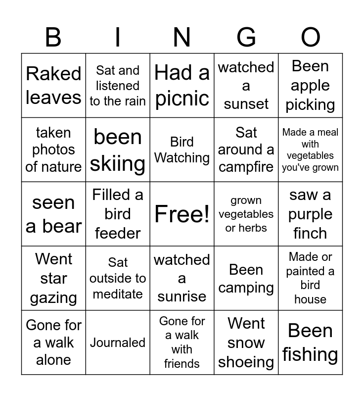 This bingo card has a free space and 24 words: Sat outside to meditate, Journaled, Bird Watching, Gone for a walk alone, Been apple picking, Raked leaves, taken photos of nature, Sat and listened to the rain, grown vegetables or herbs, watched a sunrise, Sat around a campfire, seen a bear, Been camping, Made or painted a bird house, been skiing, Went snow shoeing, saw a purple finch, Had a picnic, Made a meal with vegetables you've grown, Filled a bird feeder, Been fishing, Went star gazing, watched a sunset and Gone for a walk with friends.