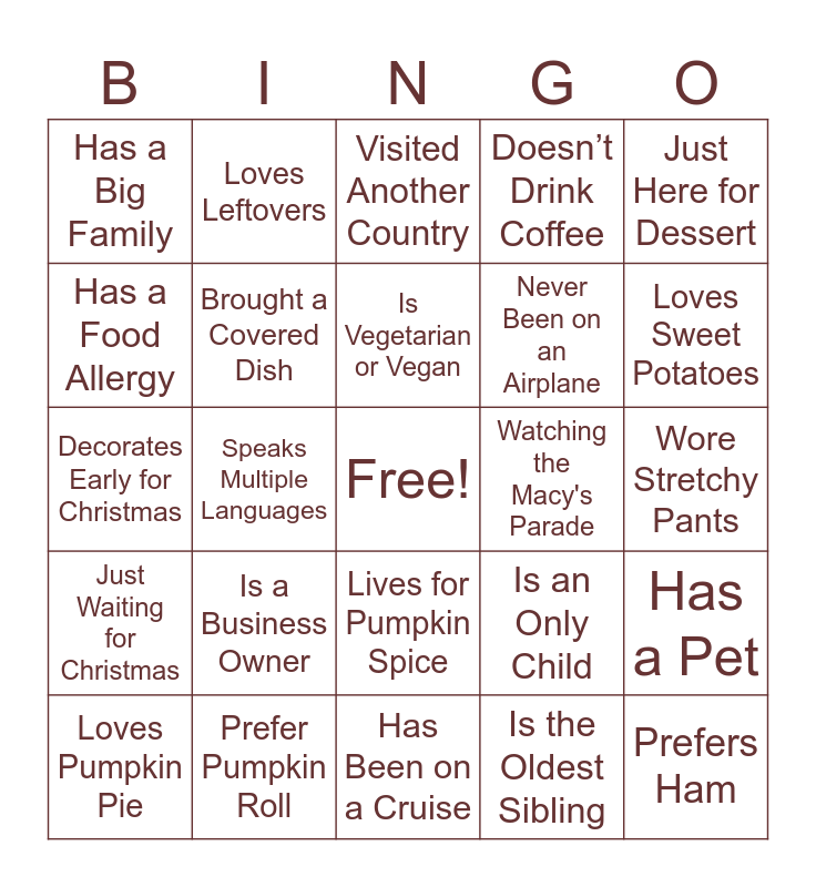 This bingo card has a free space and 24 words: Is a Business Owner, Prefer Pumpkin Roll, Is Vegetarian or Vegan, Loves Pumpkin Pie, Just Here for Dessert, Has a Big Family, Has a Food Allergy, Loves Leftovers, Watching the Macy's Parade, Lives for Pumpkin Spice, Never Been on an Airplane, Decorates Early for Christmas, Is an Only Child, Has a Pet, Brought a Covered Dish, Is the Oldest Sibling, Wore Stretchy Pants, Visited Another Country, Loves Sweet Potatoes, Speaks Multiple Languages, Prefers Ham, Just Waiting for Christmas, Doesn’t Drink Coffee and Has Been on a Cruise.