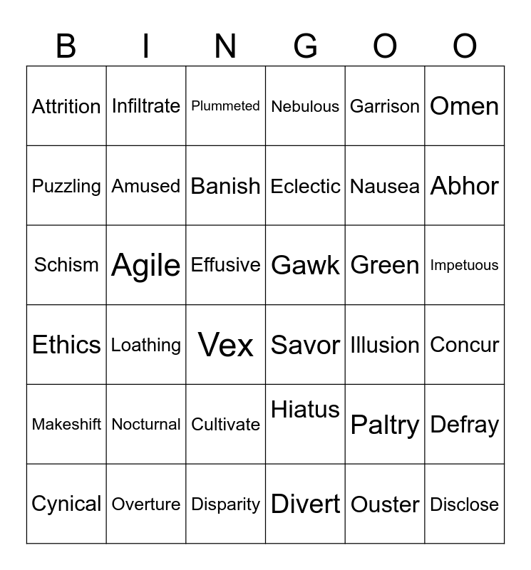 This bingo card has 48 words: Scapegoat, Schism, Jeopardy, Illusion, Green, Hiatus, Infiltrate, Spawn, Omen, Overture, Puzzling, Nebulous, Loathing, Ethics, Disclose, Cultivate, Amused, Agile, Free!, Garrison, Abhor, Concur, Attrition, Banish, Rampart, Eclectic, Vex, Intrude, Impetuous, Gawk, Obstinate, Nocturnal, Ouster, Petrified, Savor, Disparity, Divert, Effusive, Cynical, Cumbersome, Paltry, Makeshift, Plummeted, Universal, Nausea, Engulfed, Defray and Pulsate.