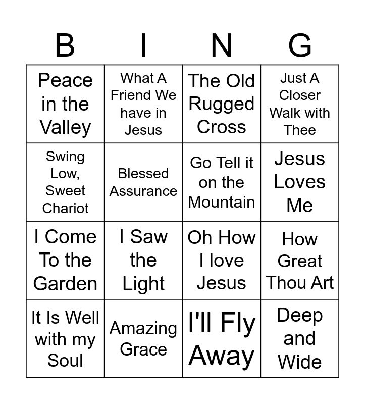 This bingo card has 16 words: Amazing Grace, How Great Thou Art, The Old Rugged Cross, Peace in the Valley, I Come To the Garden, What A Friend We have in Jesus, Oh How I love Jesus, I'll Fly Away, Swing Low, Sweet Chariot, Blessed Assurance, It Is Well with my Soul, Just A Closer Walk with Thee, I Saw the Light, Jesus Loves Me, Go Tell it on the Mountain and Deep and Wide.