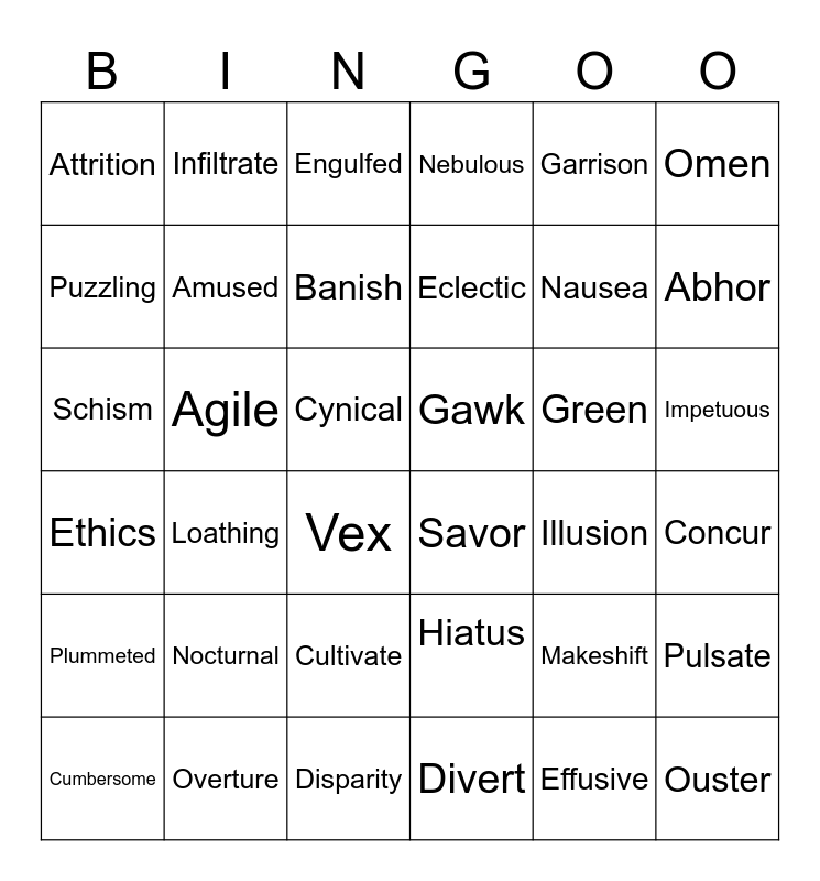 This bingo card has 49 words: Scapegoat, Schism, Jeopardy, Illusion, Green, Hiatus, Infiltrate, Spawn, Omen, Overture, Puzzling, Nebulous, Loathing, Ethics, Disclose, Cultivate, Amused, Agile, Free!, Garrison, Abhor, Concur, Attrition, Banish, Rampart, Eclectic, Vex, Intrude, Impetuous, Gawk, Obstinate, Nocturnal, Ouster, Petrified, Savor, Disparity, Divert, Effusive, Cynical, Cumbersome, Paltry, Makeshift, Plummeted, Universal, Nausea, Engulfed, Defray, Pulsate and Free!.