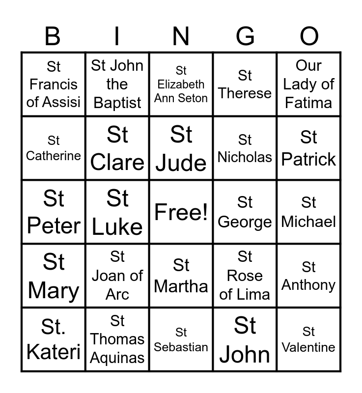 This bingo card has a free space and 24 words: St Joan of Arc, St Thomas Aquinas, St Jude, St. Kateri, Our Lady of Fatima, St Francis of Assisi, St Catherine, St John the Baptist, St George, St Martha, St Nicholas, St Peter, St Rose of Lima, St Anthony, St Clare, St John, St Michael, St Elizabeth Ann Seton, St Patrick, St Luke, St Valentine, St Mary, St Therese and St Sebastian.