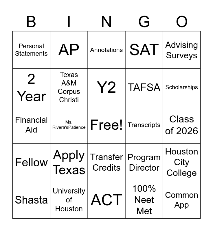 This bingo card has a free space and 36 words: Early Decision, Early Action, UT Austin, Texas A&M Corpus Christi, Program Director, Fellow, Y2, Y1, Advising Surveys, Ms. Caldwell, Ms. Rivera'sPatience, SAT, Fee Waiver, Transcripts, Scholarships, Personal Statements, 650 Word Limit, Apply Texas, Common App, Annotations, Class of 2026, Houston City College, University of Houston, Shasta, ACT, AP, Financial Aid, FAFSA, TAFSA, 2 Year, Community College, 4 Year, 100% Neet Met, Transfer Credits, Undegraduate and Graduate.
