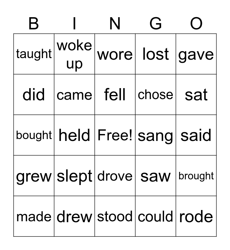 This bingo card has a free space and 40 words: was/were, bought, caught, came, drew, drove, fell, flew, gave, grew, held, lost, rode, said, sang, slept, swam, taught, thought, wore, brought, could, chose, did, drank, ate, found, got, went, had, knew, made, ran, saw, sat, stood, took, told, woke up and wrote.