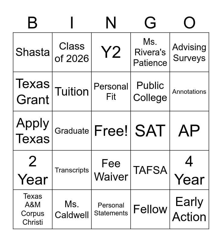 This bingo card has a free space and 45 words: Early Decision, Early Action, UT Austin, Texas A&M Corpus Christi, Program Director, Fellow, Y2, Y1, Advising Surveys, Ms. Caldwell, Ms. Rivera's Patience, SAT, Fee Waiver, Transcripts, Scholarships, Personal Statements, 650 Word Limit, Apply Texas, Common App, Annotations, Class of 2026, Houston City College, University of Houston, Shasta, ACT, AP, Financial Aid, FAFSA, TAFSA, 2 Year, Community College, 4 Year, 100% Neet Met, Transfer Credits, Undegraduate, Graduate, Tutor, Completion Supports, Quality Enrollment, Personal Fit, Texas Grant, Public College, Private College, Tuition and Purple Promise.