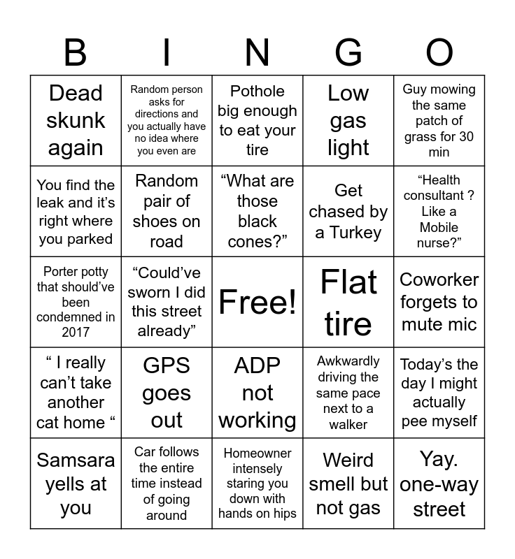 This bingo card has a free space and 24 words: Samsara yells at you, GPS goes out, “What are those black cones?”, Weird smell but not gas, Guy mowing the same patch of grass for 30 min, Dead skunk again, Random person asks for directions and you actually have no idea where you even are, Pothole big enough to eat your tire, Flat tire, Coworker forgets to mute mic, Porter potty that should’ve been condemned in 2017, Random pair of shoes on road, Awkwardly driving the same pace next to a walker, Today’s the day I might actually pee myself, You find the leak and it’s right where you parked, Car follows the entire time instead of going around, Homeowner intensely staring you down with hands on hips, Low gas light, “Health consultant ? Like a Mobile nurse?”, “ I really can’t take another cat home “, “Could’ve sworn I did this street already”, ADP not working, Get chased by a Turkey and Yay. one-way street.