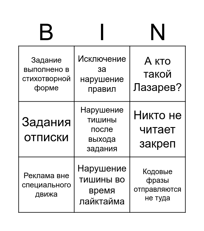This bingo card has a free space and 8 words: Никто не читает закреп, А кто такой Лазарев?, Исключение за нарушение правил, Реклама вне специального движа, Задание выполнено в стихотворной форме, Кодовые фразы отправляются не туда, Задания отписки and Нарушение тишины во время лайктайма.