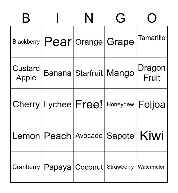 This bingo card has a free space and 28 words: Kiwi, Apple, Mango, Strawberry, Custard Apple, Orange, Pear, Lemon, Honeydew, Cranberry, Cherry, Grape, Papaya, Coconut, Dragon Fruit, Raspberry, Peach, Banana, Starfruit, Avocado, Blackberry, Pineapple, Watermelon, Lychee, Feijoa, Sapote, Tamarillo and Ugli.
