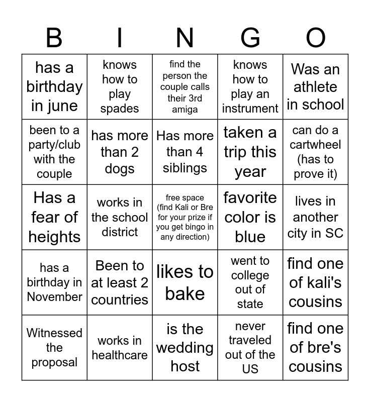 This bingo card has a free space and 24 words: Been to at least 2 countries, works in healthcare, Has more than 4 siblings, Witnessed the proposal, Was an athlete in school, has a birthday in june, been to a party/club with the couple, knows how to play spades, favorite color is blue, likes to bake, taken a trip this year, Has a fear of heights, went to college out of state, find one of kali's cousins, has more than 2 dogs, never traveled out of the US, lives in another city in SC, find the person the couple calls their 3rd amiga, can do a cartwheel (has to prove it), works in the school district, find one of bre's cousins, has a birthday in November, knows how to play an instrument and is the wedding host.