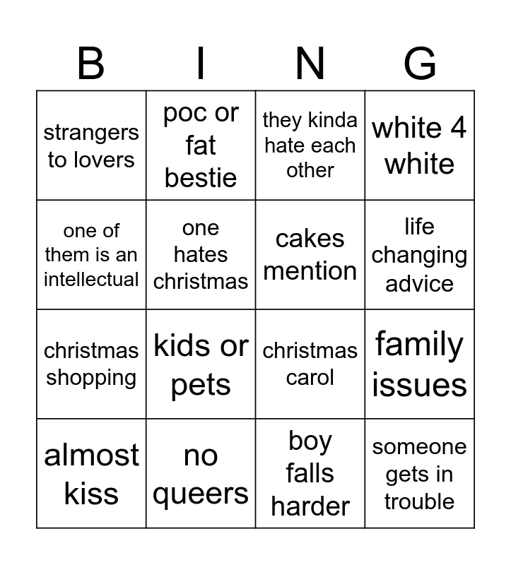 This bingo card has 16 words: no queers, family issues, they kinda hate each other, strangers to lovers, christmas shopping, poc or fat bestie, christmas carol, boy falls harder, one of them is an intellectual, one hates christmas, almost kiss, white 4 white, kids or pets, life changing advice, cakes mention and someone gets in trouble.