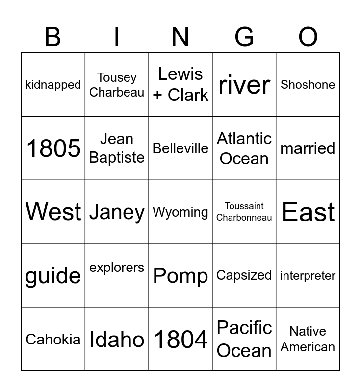This bingo card has a free space and 24 words: explorers, Idaho, Belleville, Cahokia, Shoshone, kidnapped, 1805, Tousey Charbeau, Toussaint Charbonneau, Pomp, Atlantic Ocean, West, Capsized, interpreter, Jean Baptiste, Pacific Ocean, East, Lewis + Clark, married, Janey, Native American, guide, river and 1804.