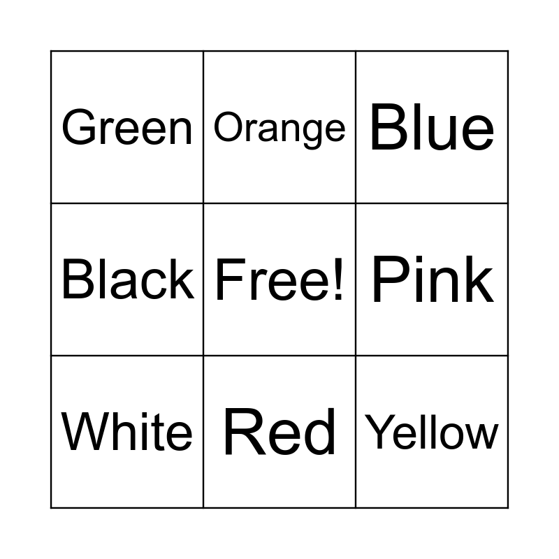 This bingo card has a free space and 10 words: Red, Blue, Green, Yellow, Black, White, Orange, Purple, Pink and Gray.