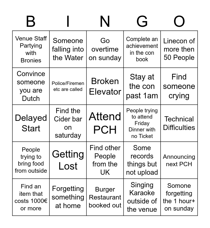 This bingo card has a free space and 24 words: Getting Lost, Forgetting something at home, Broken Elevator, Find an item that costs 1000€ or more, Linecon of more then 50 People, Venue Staff Partying with Bronies, Convince someone you are Dutch, Someone falling into the Water, People trying to attend Friday Dinner with no Ticket, Find other People from the UK, Stay at the con past 1am, Delayed Start, Some records things but not upload, Announcing next PCH, Police/Firemen etc are called, Singing Karaoke outside of the venue, Technical Difficulties, Go overtime on sunday, Find someone crying, Find the Cider bar on saturday, Somone forgetting the 1 hour+ on sunday, People trying to bring food from outside, Complete an achievement in the con book and Burger Restaurant booked out.