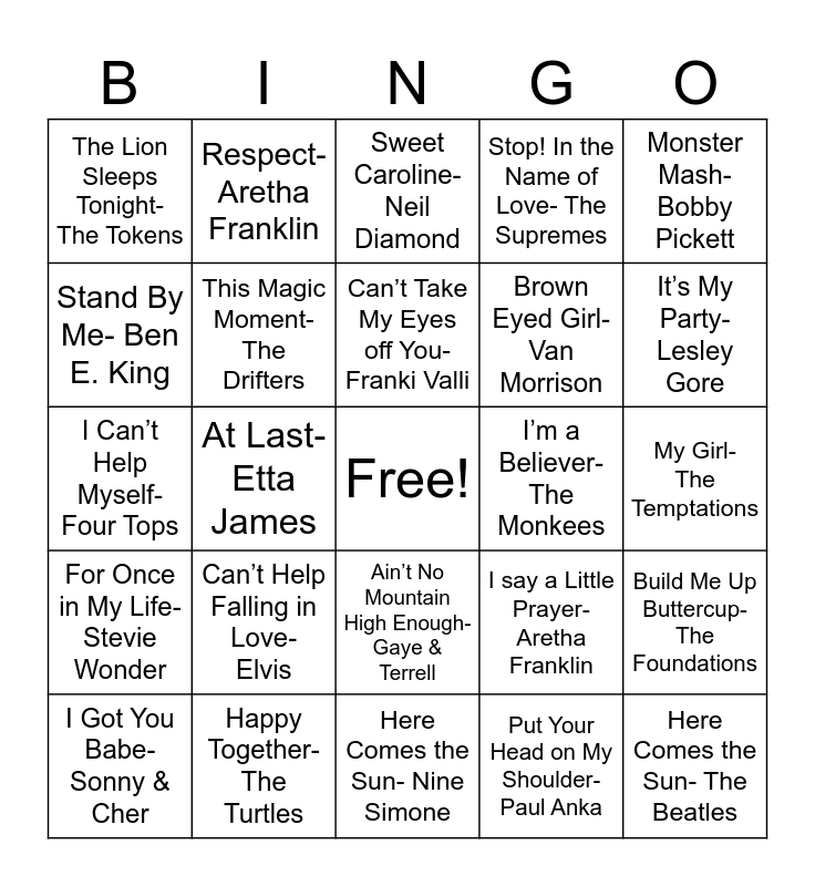This bingo card has a free space and 42 words: What a Wonderful World- Louis Armstrong, Can’t Take My Eyes off You- Franki Valli, L-O-V-E- Nat King Cole, Can’t Help Falling in Love- Elvis, Put Your Head on My Shoulder- Paul Anka, Build Me Up Buttercup- The Foundations, Here Comes the Sun- The Beatles, A Sunday King of Love- Etta James, Sweet Caroline- Neil Diamond, Ain’t No Mountain High Enough- Gaye & Terrell, My Girl- The Temptations, It’s My Party- Lesley Gore, At Last- Etta James, Monster Mash- Bobby Pickett, Fly Me to the Moon- Sinatra, I say a Little Prayer- Aretha Franklin, Higher & Higher- Jackie Wilson, I Can’t Help Myself- Four Tops, Hit the Road Jack- Ray Charles, Respect- Aretha Franklin, Stand By Me- Ben E. King, You Can’t Hurry Love- The Supremes, Unchained Melody- The Righteous Brothers, The Lion Sleeps Tonight- The Tokens, Sugar Sugar- The Archies, A Natural Women- Aretha Franklin, Brown Eyed Girl- Van Morrison, Do You Believe in Magic?- The Lovin’ Spoonful, Do You Love Me- The Contours, My Way- Frank Sinatra, Wonderful World- Sam Cooke, For Once in My Life- Stevie Wonder, This Magic Moment- The Drifters, Here Comes the Sun- Nine Simone, The Sound of Silence- Simon & Garfunkel, I Got You Babe- Sonny & Cher, Happy Together- The Turtles, I’m a Believer- The Monkees, Mustang Sally- Wilson Pickett, Hey Jude- The Beatles, Stop! In the Name of Love- The Supremes and Son of a Preacher Man- Dusty Springfield.