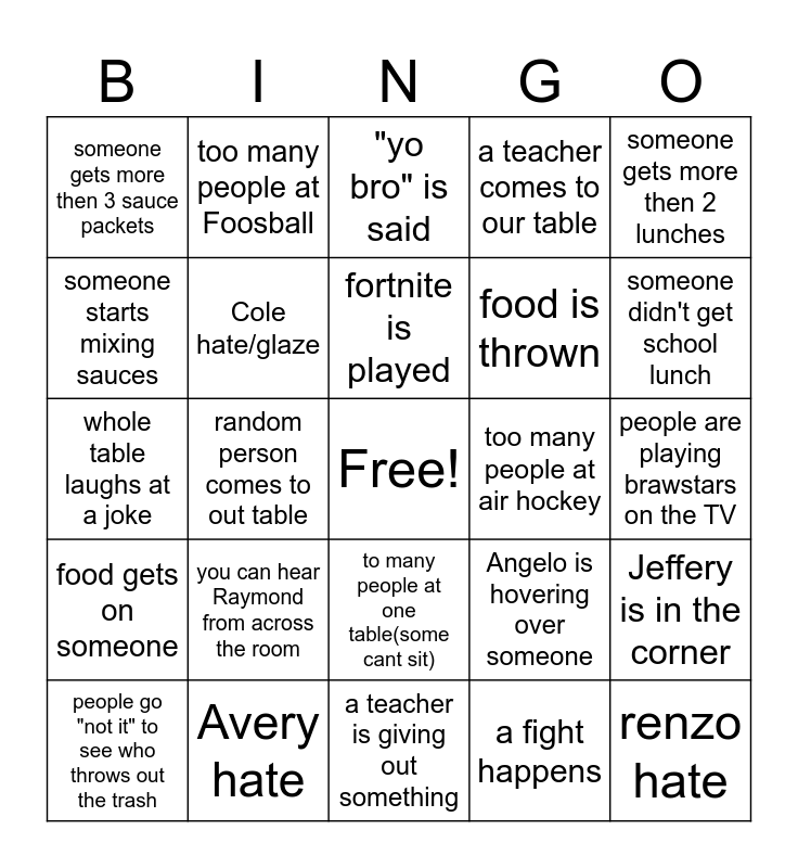 This bingo card has a free space and 24 words: you can hear Raymond from across the room, Avery hate, fortnite is played, people go "not it" to see who throws out the trash, someone gets more then 2 lunches, someone gets more then 3 sauce packets, someone starts mixing sauces, too many people at Foosball, too many people at air hockey, to many people at one table(some cant sit), food is thrown, whole table laughs at a joke, Angelo is hovering over someone, Jeffery is in the corner, Cole hate/glaze, a fight happens, people are playing brawstars on the TV, "yo bro" is said, someone didn't get school lunch, random person comes to out table, renzo hate, food gets on someone, a teacher comes to our table and a teacher is giving out something.