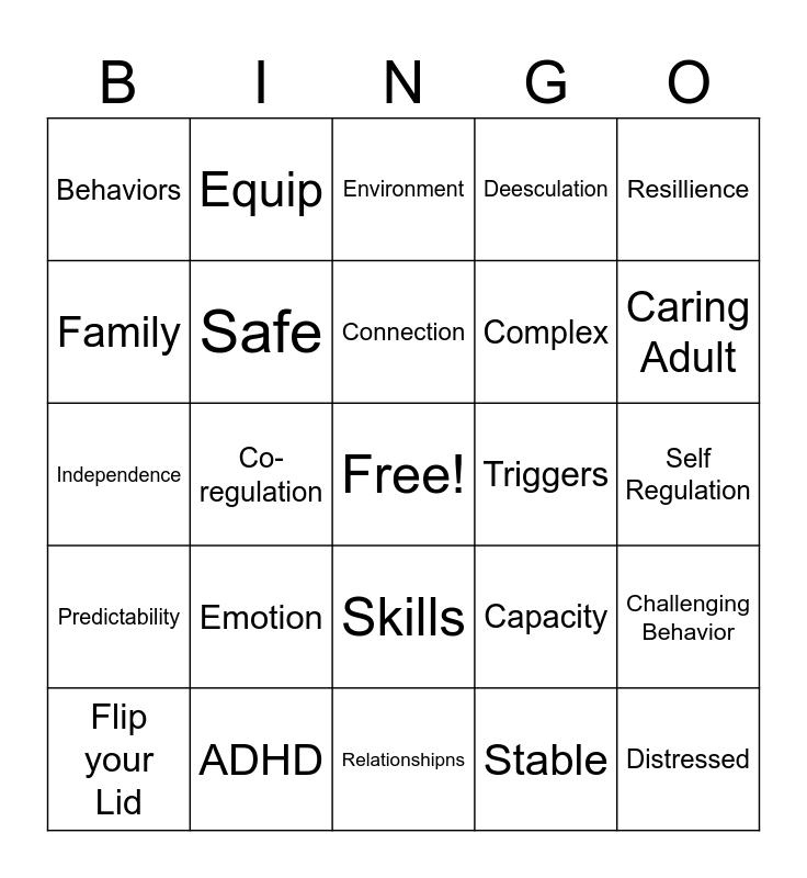 This bingo card has a free space and 29 words: Flip your Lid, Diffuse Emotion, Co-regulation, Truama, Behaviors, Environment, Safe, Emotion, Triggers, ADHD, Self Regulation, Distressed, Relationshipns, Stable, Caring Adult, Defiance, Skills, Predictability, Resillience, Independence, Capacity, Executive Functioning, Complex, Family, Deesculation, Equip, Challenging Behavior, Connection and Responsibility.
