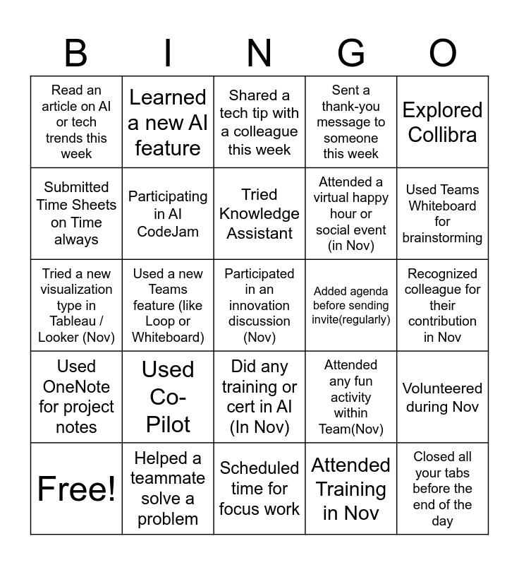 This bingo card has a free space and 24 words: Free!, Used Co-Pilot, Tried Knowledge Assistant, Attended Training in Nov, Explored Collibra, Read an article on AI or tech trends this week, Learned a new AI feature, Shared a tech tip with a colleague this week, Added agenda before sending invite(regularly), Recognized colleague for their contribution in Nov, Tried a new visualization type in Tableau / Looker (Nov), Participating in AI CodeJam, Attended any fun activity within Team(Nov), Volunteered during Nov, Submitted Time Sheets on Time always, Helped a teammate solve a problem, Scheduled time for focus work, Sent a thank-you message to someone this week, Used Teams Whiteboard for brainstorming, Used OneNote for project notes, Used a new Teams feature (like Loop or Whiteboard), Did any training or cert in AI (In Nov), Attended a virtual happy hour or social event (in Nov) and Closed all your tabs before the end of the day.