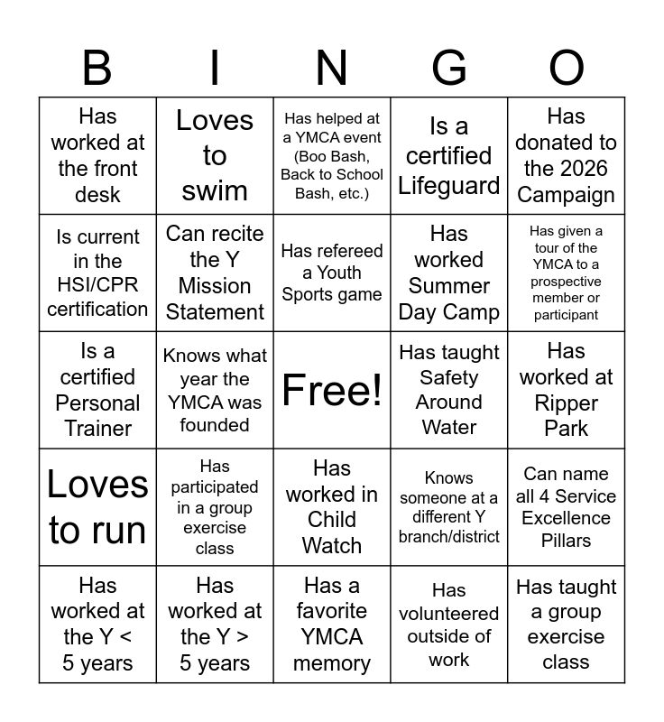 This bingo card has a free space and 24 words: Has participated in a group exercise class, Has worked at the Y > 5 years, Has refereed a Youth Sports game, Has worked at the Y < 5 years, Has donated to the 2026 Campaign, Has worked at the front desk, Is current in the HSI/CPR certification, Loves to swim, Has taught Safety Around Water, Has worked in Child Watch, Has worked Summer Day Camp, Is a certified Personal Trainer, Knows someone at a different Y branch/district, Can name all 4 Service Excellence Pillars, Can recite the Y Mission Statement, Has volunteered outside of work, Has worked at Ripper Park, Has helped at a YMCA event (Boo Bash, Back to School Bash, etc.), Has given a tour of the YMCA to a prospective member or participant, Knows what year the YMCA was founded, Has taught a group exercise class, Loves to run, Is a certified Lifeguard and Has a favorite YMCA memory.