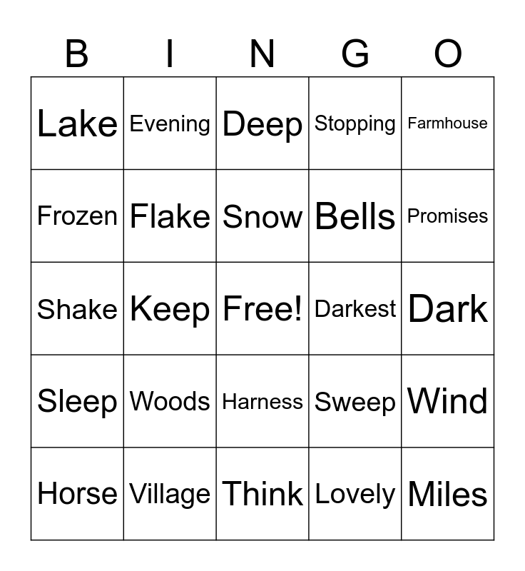 This bingo card has a free space and 24 words: Woods, Village, Snow, Horse, Farmhouse, Lake, Frozen, Evening, Darkest, Harness, Bells, Shake, Sweep, Wind, Flake, Lovely, Dark, Deep, Promises, Keep, Miles, Sleep, Stopping and Think.