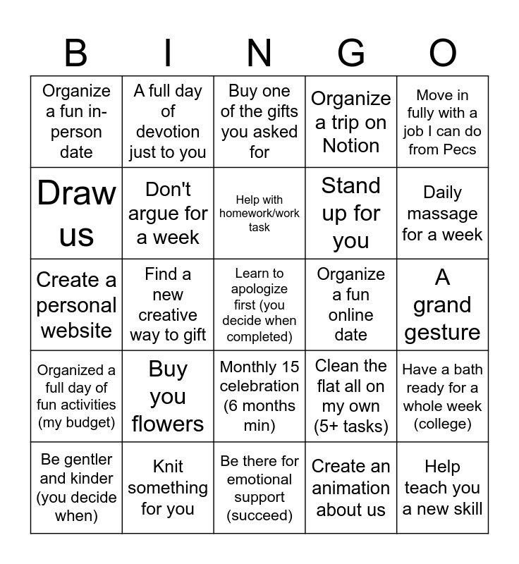 This bingo card has a free space and 24 words: Buy you flowers, Knit something for you, Help with homework/work task, Be gentler and kinder (you decide when), Move in fully with a job I can do from Pecs, Organize a fun in-person date, Draw us, A full day of devotion just to you, Organize a fun online date, Monthly 15 celebration (6 months min), Stand up for you, Create a personal website, Clean the flat all on my own (5+ tasks), Have a bath ready for a whole week (college), Don't argue for a week, Create an animation about us, A grand gesture, Buy one of the gifts you asked for, Daily massage for a week, Find a new creative way to gift, Help teach you a new skill, Organized a full day of fun activities (my budget), Organize a trip on Notion and Be there for emotional support (succeed).