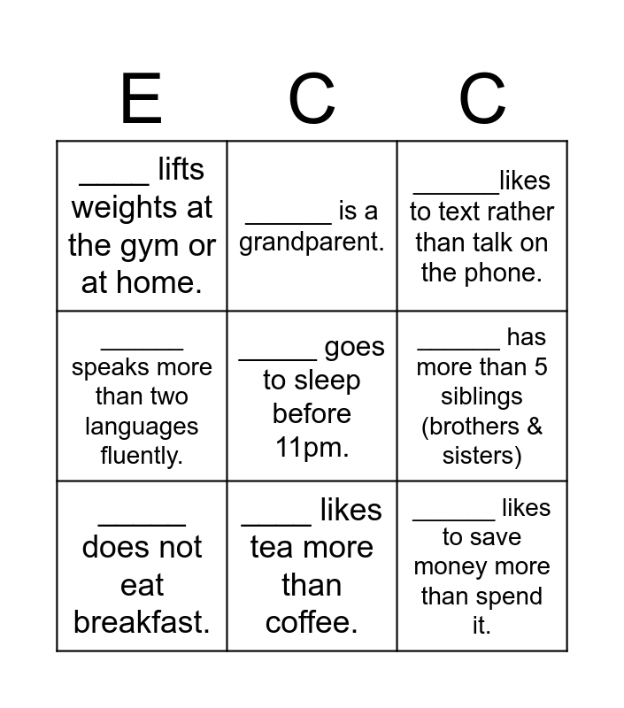 This bingo card has a free space and 8 words: ______ has more than 5 siblings (brothers & sisters), ______likes to text rather than talk on the phone., ______ is a grandparent., _____ does not eat breakfast., ____ lifts weights at the gym or at home., ______ likes to save money more than spend it., ______ speaks more than two languages fluently. and ____ likes tea more than coffee..