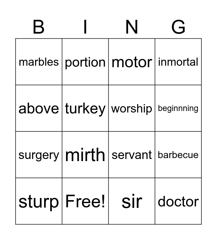 This bingo card has 22 words: Free!, tarnish, portion, circulate, turkey, worship, marbles, motor, servant, doctor, surgery, inmortal, messenger, giraffe, sir, sword, barbecue, sturp, mirth, above, beginnning and Mediterranean.
