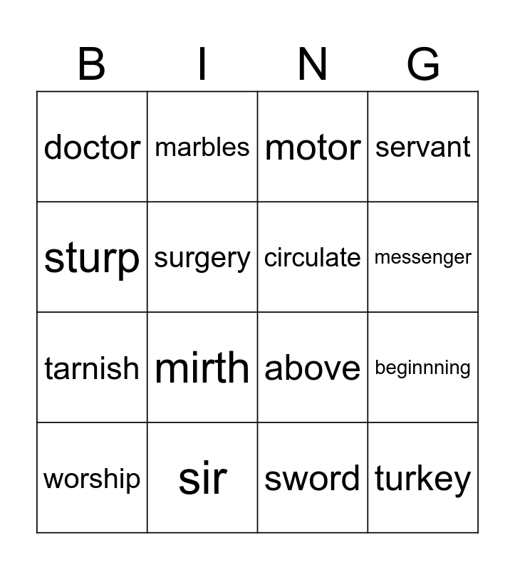 This bingo card has 21 words: tarnish, portion, circulate, turkey, worship, marbles, motor, servant, doctor, surgery, inmortal, messenger, giraffe, sir, sword, barbecue, sturp, mirth, above, beginnning and Mediterranean.