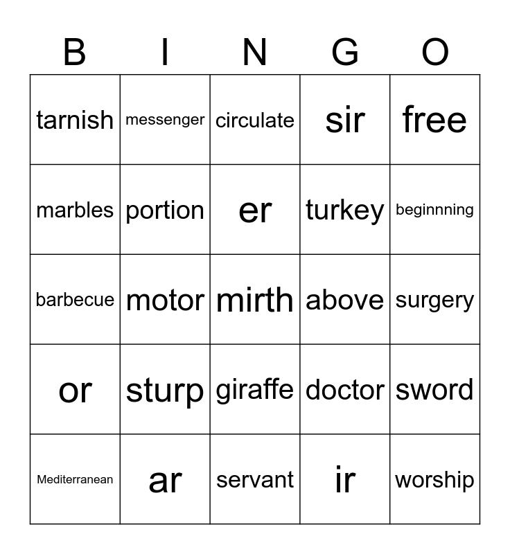 This bingo card has 26 words: or, ar, er, ir, free, tarnish, portion, circulate, turkey, worship, marbles, motor, servant, doctor, surgery, inmortal, messenger, giraffe, sir, sword, barbecue, sturp, mirth, above, beginnning and Mediterranean.