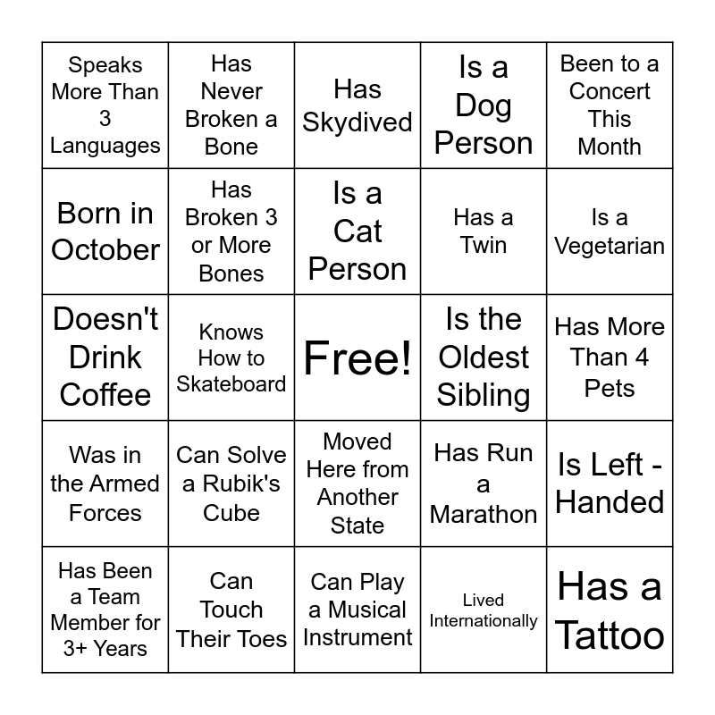 This bingo card has a free space and 24 words: Can Solve a Rubik's Cube, Can Touch Their Toes, Is a Cat Person, Has Been a Team Member for 3+ Years, Been to a Concert This Month, Speaks More Than 3 Languages, Born in October, Has Never Broken a Bone, Is the Oldest Sibling, Moved Here from Another State, Has a Twin, Doesn't Drink Coffee, Has Run a Marathon, Is Left - Handed, Has Broken 3 or More Bones, Lived Internationally, Has More Than 4 Pets, Has Skydived, Is a Vegetarian, Knows How to Skateboard, Has a Tattoo, Was in the Armed Forces, Is a Dog Person and Can Play a Musical Instrument.