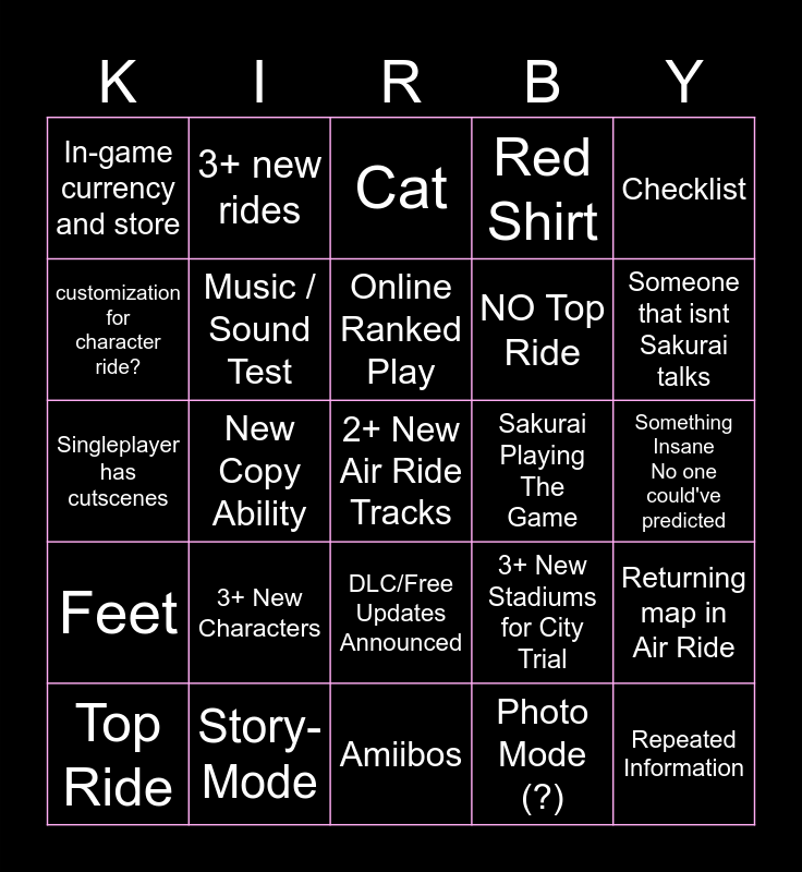 This bingo card has a free space and 24 words: 3+ New Characters, Story-Mode, Online Ranked Play, Top Ride, Checklist, In-game currency and store, customization for character ride?, 3+ new rides, Sakurai Playing The Game, DLC/Free Updates Announced, NO Top Ride, Singleplayer has cutscenes, 3+ New Stadiums for City Trial, Returning map in Air Ride, Music / Sound Test, Photo Mode (?), Something Insane No one could've predicted, Cat, Someone that isnt Sakurai talks, New Copy Ability, Repeated Information, Feet, Red Shirt and Amiibos.