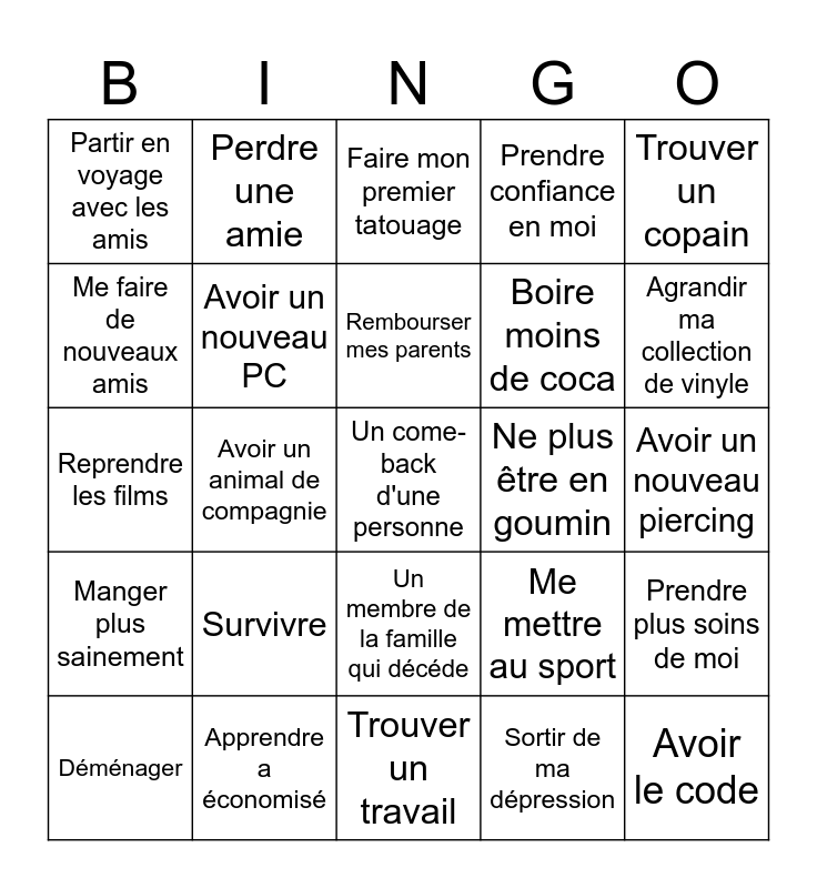 This bingo card has 25 words: Survivre, Trouver un travail, Rembourser mes parents, Déménager, Trouver un copain, Partir en voyage avec les amis, Me faire de nouveaux amis, Perdre une amie, Ne plus être en goumin, Un membre de la famille qui décéde, Boire moins de coca, Reprendre les films, Me mettre au sport, Prendre plus soins de moi, Avoir un nouveau PC, Avoir le code, Avoir un nouveau piercing, Faire mon premier tatouage, Agrandir ma collection de vinyle, Avoir un animal de compagnie, Un come-back d'une personne, Apprendre a économisé, Manger plus sainement, Prendre confiance en moi and Sortir de ma dépression.