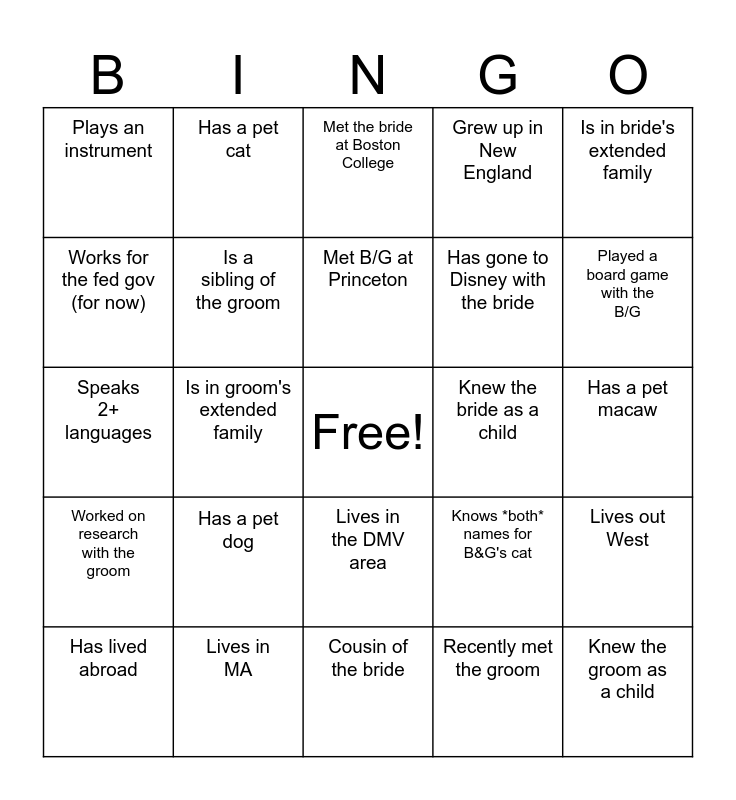 This bingo card has a free space and 24 words: Has a pet dog, Lives in MA, Met B/G at Princeton, Has lived abroad, Is in bride's extended family, Plays an instrument, Works for the fed gov (for now), Has a pet cat, Knew the bride as a child, Lives in the DMV area, Has gone to Disney with the bride, Speaks 2+ languages, Knows *both* names for B&G's cat, Lives out West, Is a sibling of the groom, Recently met the groom, Has a pet macaw, Met the bride at Boston College, Played a board game with the B/G, Is in groom's extended family, Knew the groom as a child, Worked on research with the groom, Grew up in New England and Cousin of the bride.