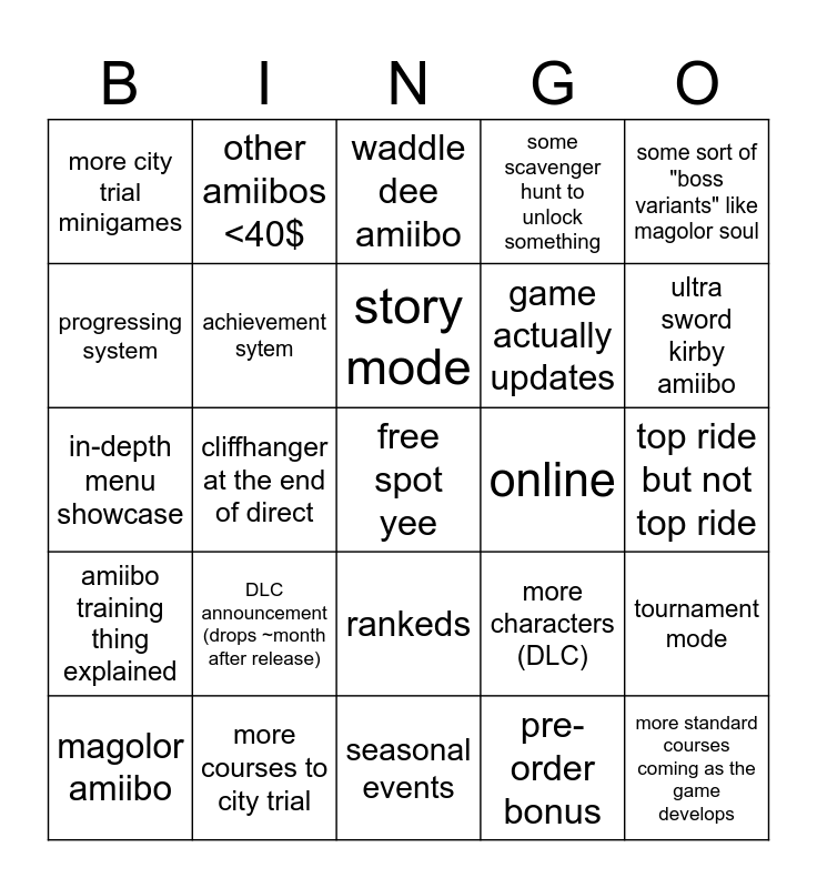 This bingo card has a free space and 24 words: DLC announcement (drops ~month after release), more courses to city trial, story mode, magolor amiibo, some sort of "boss variants" like magolor soul, more city trial minigames, progressing system, other amiibos <40$, online, rankeds, game actually updates, in-depth menu showcase, more characters (DLC), tournament mode, achievement sytem, pre-order bonus, top ride but not top ride, waddle dee amiibo, ultra sword kirby amiibo, cliffhanger at the end of direct, more standard courses coming as the game develops, amiibo training thing explained, some scavenger hunt to unlock something and seasonal events.