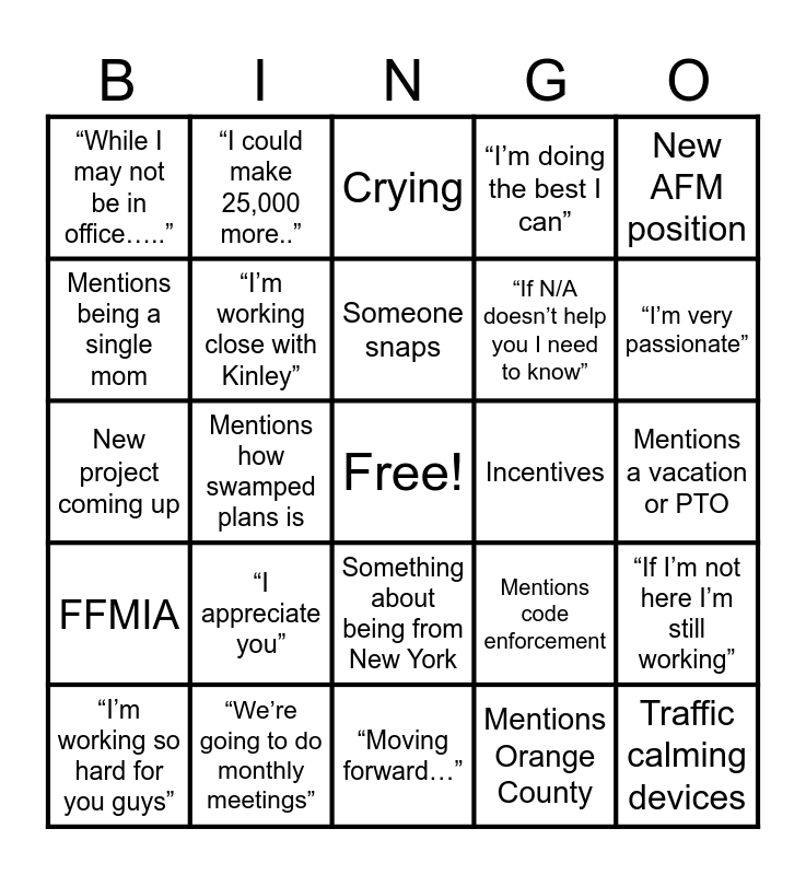 This bingo card has a free space and 24 words: “I appreciate you”, “We’re going to do monthly meetings”, Someone snaps, “I’m working so hard for you guys”, New AFM position, “While I may not be in office…..”, Mentions being a single mom, “I could make 25,000 more..”, Incentives, Something about being from New York, “If N/A doesn’t help you I need to know”, New project coming up, Mentions code enforcement, “If I’m not here I’m still working”, “I’m working close with Kinley”, Mentions Orange County, Mentions a vacation or PTO, Crying, “I’m very passionate”, Mentions how swamped plans is, Traffic calming devices, FFMIA, “I’m doing the best I can” and “Moving forward…”.