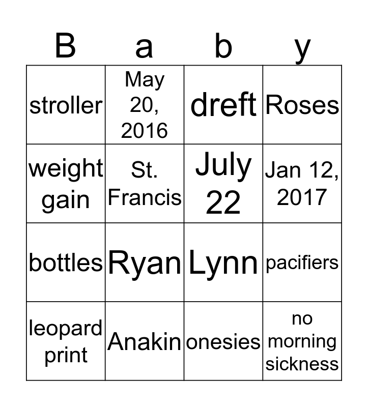 This bingo card has 16 words: Anakin, pacifiers, dreft, stroller, bottles, May 20, 2016, Lynn, onesies, weight gain, St. Francis, leopard print, Roses, Ryan, Jan 12, 2017, July 22 and no morning sickness.