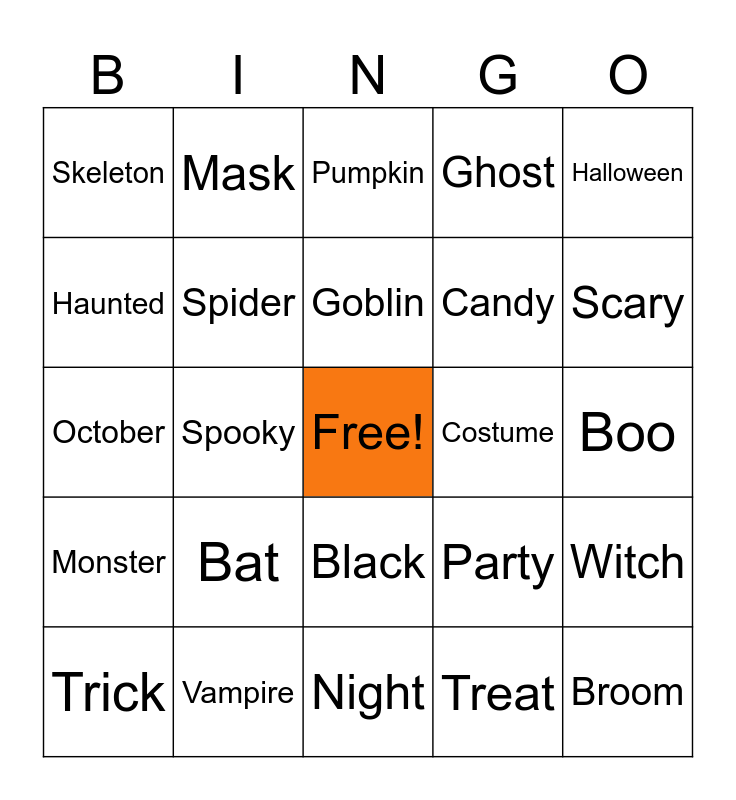 This bingo card has a free space and 24 words: Bat, Vampire, Goblin, Trick, Halloween, Skeleton, Haunted, Mask, Costume, Black, Candy, October, Party, Witch, Spider, Treat, Boo, Pumpkin, Scary, Spooky, Broom, Monster, Ghost and Night.