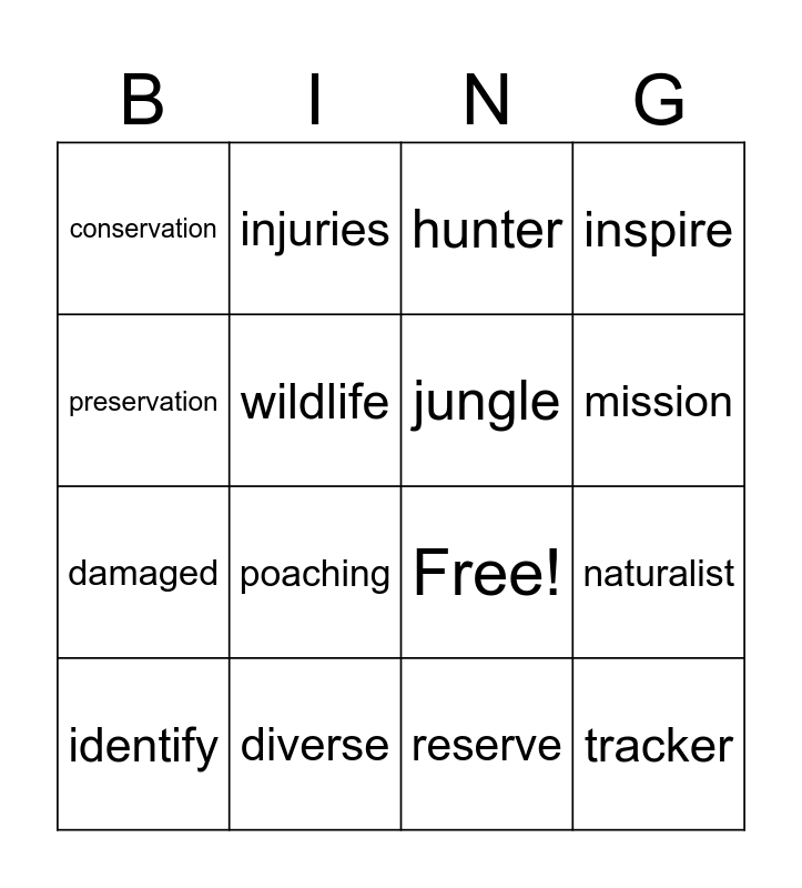 This bingo card has 19 words: Free!, population, hunter, tracker, naturalist, preservation, reserve, conservation, injuries, damaged, poaching, wildlife, jungle, diverse, identify, protect, inspire, mission and national park.