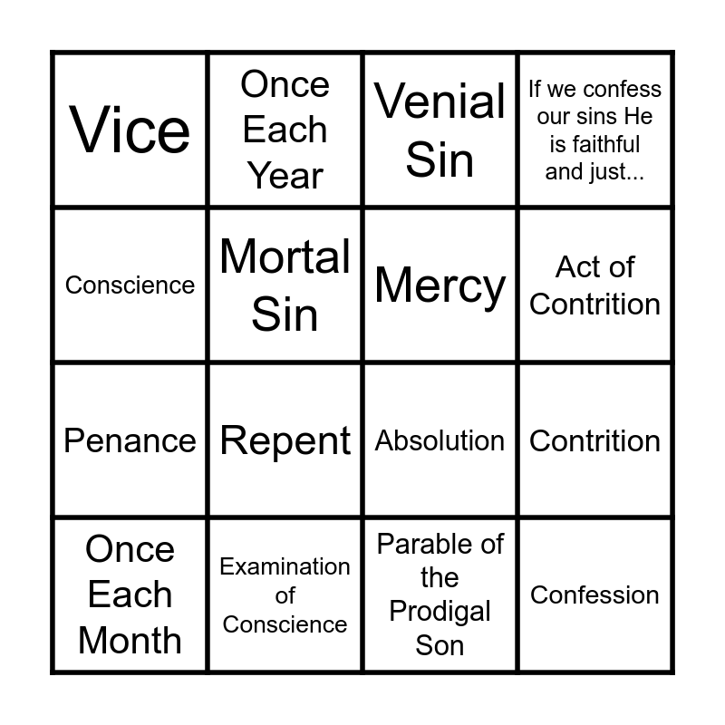 This bingo card has 16 words: Examination of Conscience, Contrition, Venial Sin, Vice, Penance, Once Each Year, Absolution, Parable of the Prodigal Son, Conscience, Mortal Sin, Once Each Month, If we confess our sins He is faithful and just..., Repent, Act of Contrition, Mercy and Confession.