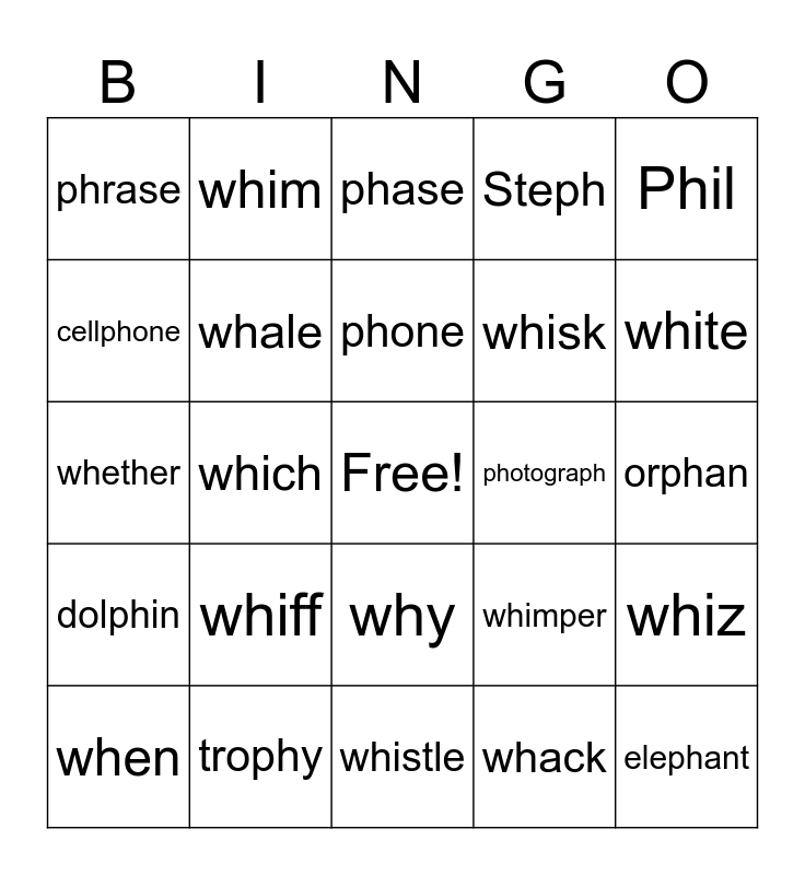 This bingo card has a free space and 32 words: whack, graph, which, whip, dolphin, whale, Phil, whiz, whim, alphabet, phone, phase, newphew, microphone, photograph, where, when, whether, why, whiff, whimper, what, orphan, trophy, elephant, Steph, whisk, cellphone, phrase, whistle, whine and white.