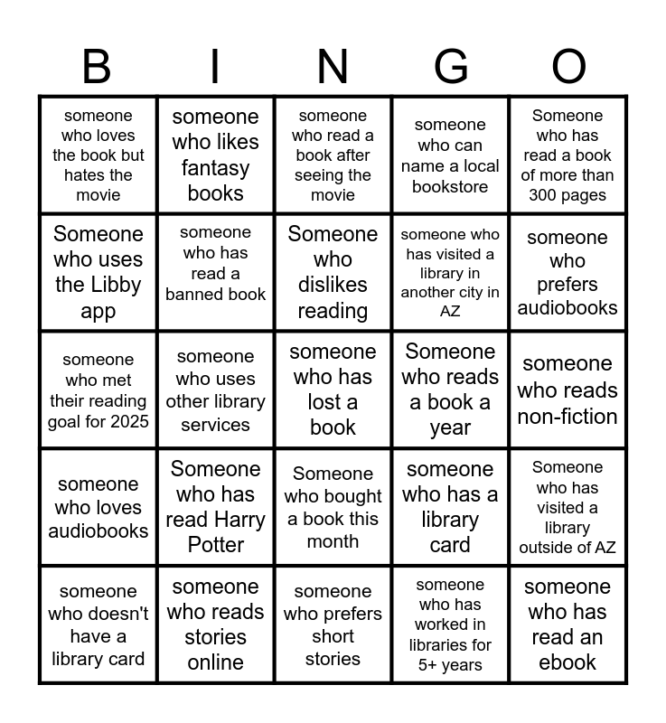 This bingo card has 25 words: Someone who has read Harry Potter, someone who prefers short stories, Someone who dislikes reading, someone who doesn't have a library card, Someone who has read a book of more than 300 pages, someone who loves the book but hates the movie, Someone who uses the Libby app, someone who likes fantasy books, Someone who reads a book a year, Someone who bought a book this month, someone who has visited a library in another city in AZ, someone who met their reading goal for 2025, someone who has a library card, Someone who has visited a library outside of AZ, someone who has read a banned book, someone who has read an ebook, someone who reads non-fiction, someone who read a book after seeing the movie, someone who prefers audiobooks, someone who uses other library services, someone who has lost a book, someone who reads stories online, someone who loves audiobooks, someone who can name a local bookstore and someone who has worked in libraries for 5+ years.