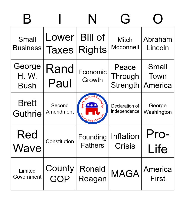 This bingo card has a free space and 24 words: Constitution, County GOP, Economic Growth, Limited Government, Abraham Lincoln, Small Business, George H. W. Bush, Lower Taxes, Declaration of Independence, Founding Fathers, Peace Through Strength, Brett Guthrie, Inflation Crisis, Pro-Life, Rand Paul, MAGA, George Washington, Bill of Rights, Small Town America, Second Amendment, America First, Red Wave, Mitch Mcconnell and Ronald Reagan.