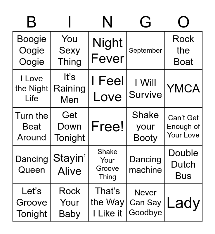 This bingo card has a free space and 43 words: Ladies Night, Lady, Le Freak, Let’s Groove Tonight, Macho Man, Never Can Say Goodbye, Night Fever, Play that Funky Music, Rock the Boat, Rock Your Baby, September, Shake your Booty, Shake Your Groove Thing, Stayin’ Alive, Superfreak, That’s the Way I Like it, The Hustle, Turn the Beat Around, We are Family, YMCA, You Sexy Thing, You’re the First, Last…, Ain’t No Stoppin’ Us Now, Boogie Oogie Oogie, Boogie Wonderland, Can’t Get Enough of Your Love, Car Wash, Celebration, Dancing machine, Dancing Queen, Disco Inferno, Double Dutch Bus, Funky Town, Get Down Tonight, Gimmie Gimmie Gimmie, Honey Bee, Hot Stuff, I Feel Love, I Love the Night Life, I Will Survive, I’m So Excited, It’s Raining Men and Knock on Wood.