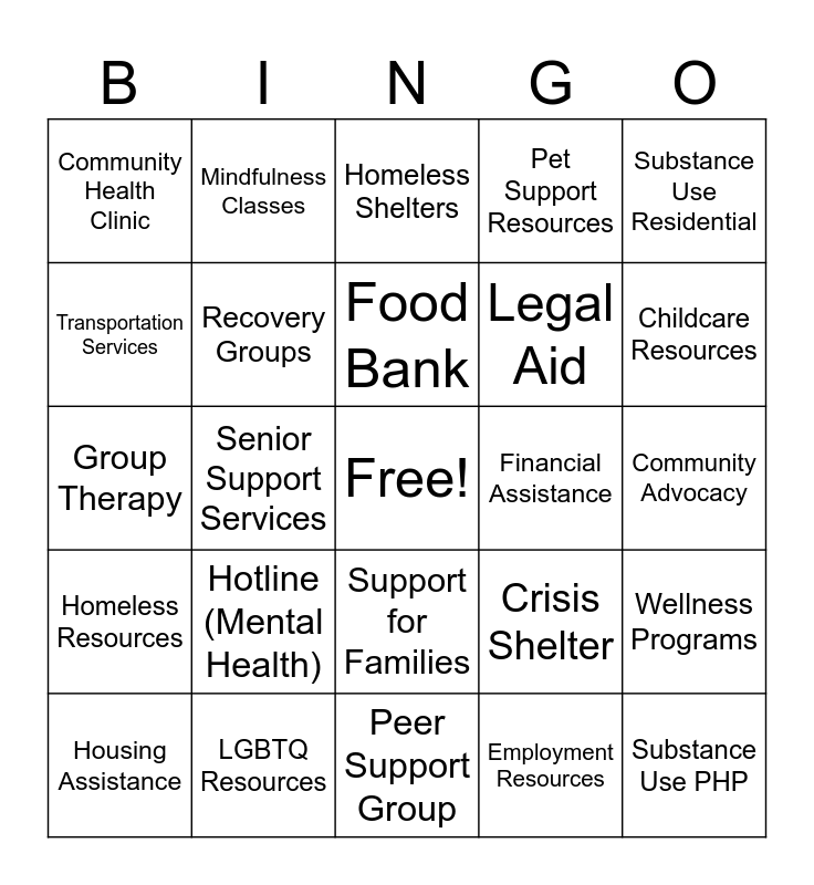 This bingo card has a free space and 25 words: Hotline (Mental Health), Peer Support Group, Food Bank, Housing Assistance, Substance Use Residential, Community Health Clinic, Transportation Services, Mindfulness Classes, Financial Assistance, Support for Families, Legal Aid, Group Therapy, Crisis Shelter, Wellness Programs, Recovery Groups, Substance Use IOP, Community Advocacy, Homeless Shelters, Childcare Resources, Senior Support Services, Substance Use PHP, LGBTQ Resources, Homeless Resources, Pet Support Resources and Employment Resources.