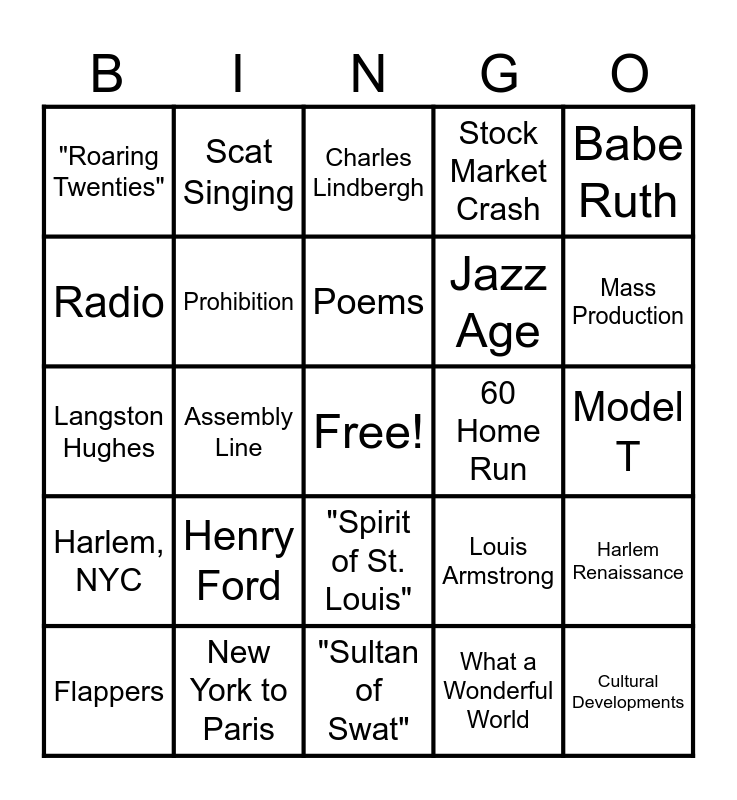 This bingo card has a free space and 25 words: Henry Ford, "Sultan of Swat", Poems, Flappers, Babe Ruth, "Roaring Twenties", Radio, Scat Singing, 60 Home Run, "Spirit of St. Louis", Jazz Age, Langston Hughes, Louis Armstrong, Harlem Renaissance, Prohibition, Suburbs, Model T, Charles Lindbergh, Mass Production, Assembly Line, Cultural Developments, New York to Paris, Harlem, NYC, Stock Market Crash and What a Wonderful World.