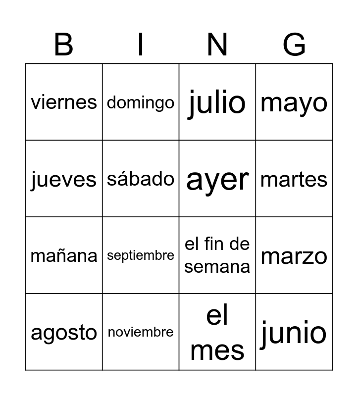 This bingo card has 26 words: la semana, lunes, martes, miércoles, jueves, viernes, sábado, domingo, el mes, hoy, mañana, el fin de semana, enero, febrero, marzo, abril, mayo, junio, julio, agosto, septiembre, octubre, noviembre, diciembre, ayer and el año.